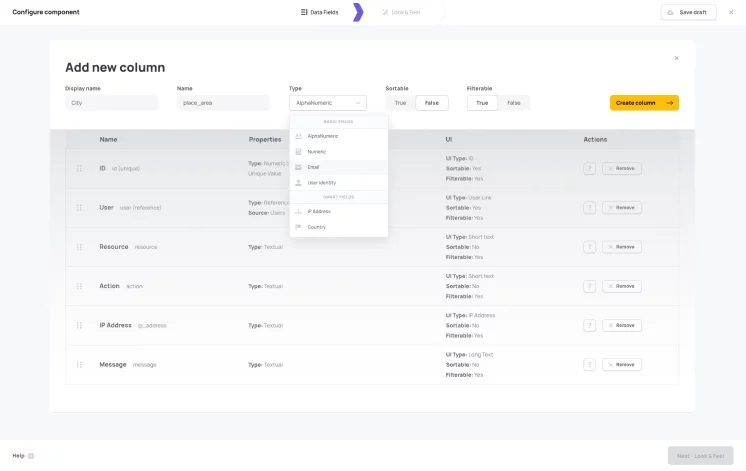 Define the audit log model and include the data type - all audit logs are searchable and sortable.